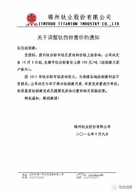 锦州钛业10月9日发布关于调整钛白粉售价的通知称,受国际、国内钛白粉市场及原材料价格上涨影响,公司决定即日起,各牌号钛白粉售价上调500元/吨(经销商大客户除外)。具体详情见调价函: