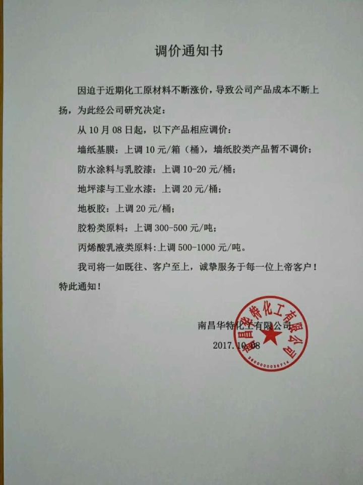 原材料涨价一波未停一波又起,各企业争先恐后涨价。日前,南昌华特化工有限公司发布调价通知书称,因迫于近期化工原材料不断涨价,导致公司产品成本不断上扬,为此决定10月8日起,防水涂料与乳胶漆上调10-20元/桶;地坪漆与工业水漆上调20元/桶;丙烯酸乳液类原料上调500-1000元/吨。