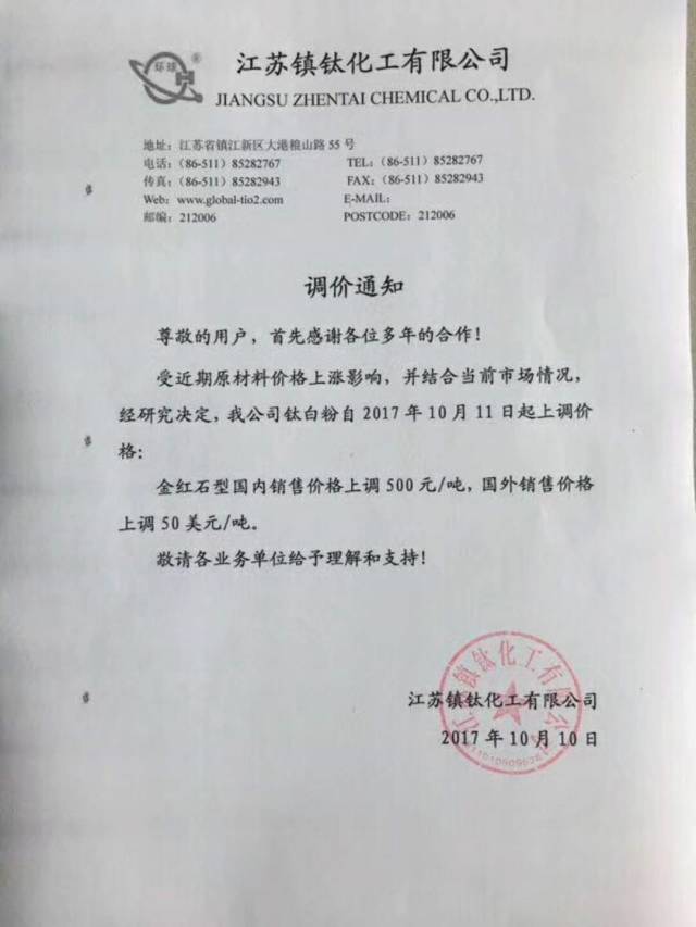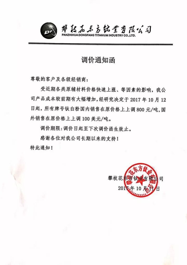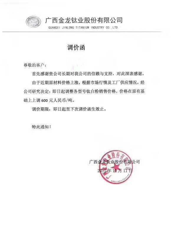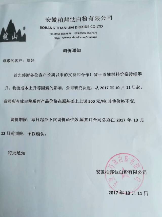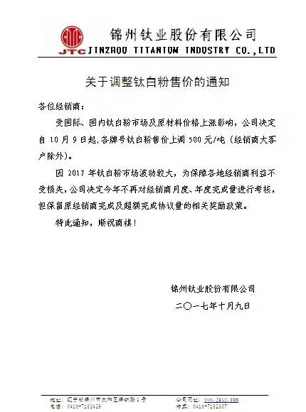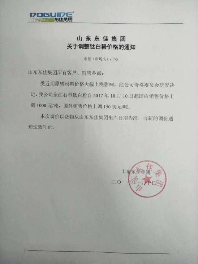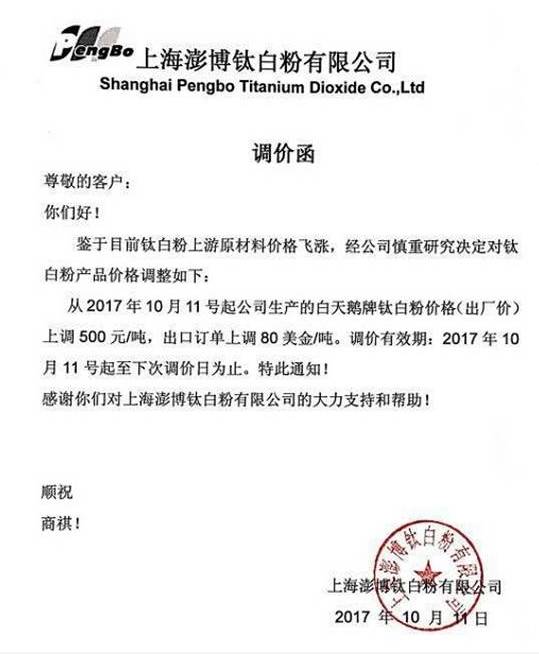自10月9号以来,短短3天之内,以龙蟒佰利、山东东佳、中核钛白为代表的15家钛白粉企业集体发布涨价通知。据了解,本轮上调幅度基本为500元/吨,出口价格上涨幅度为50美元/吨、80美元/吨。