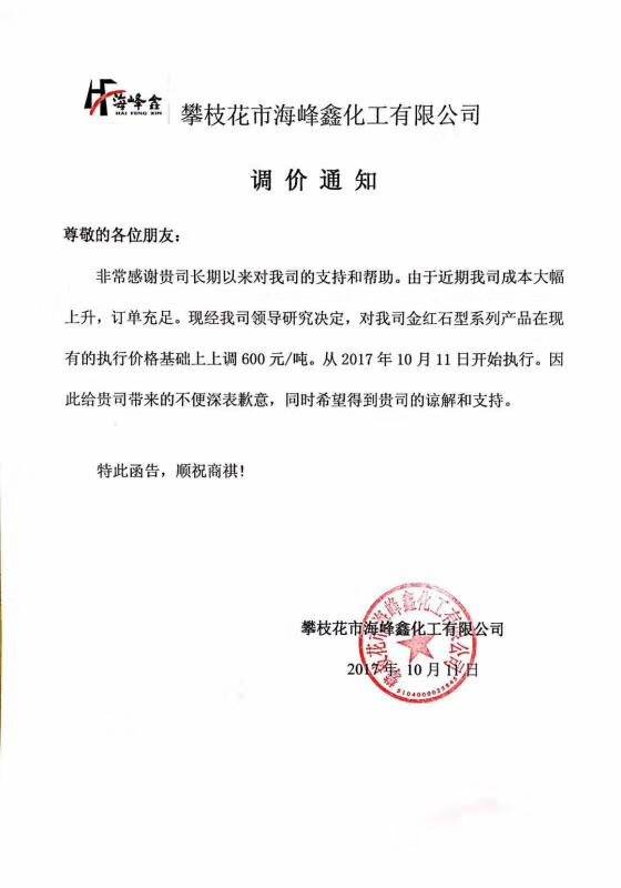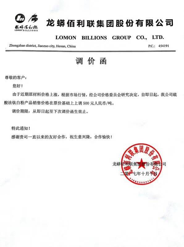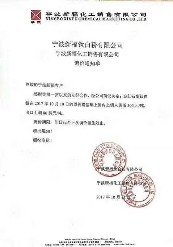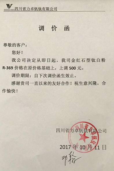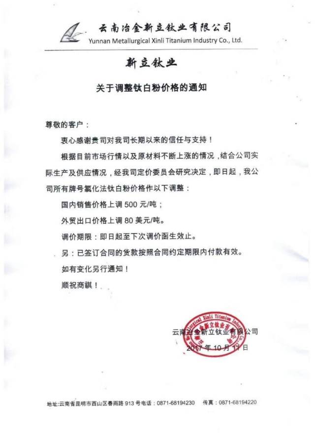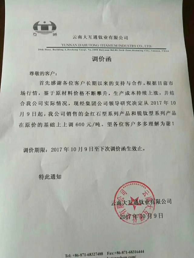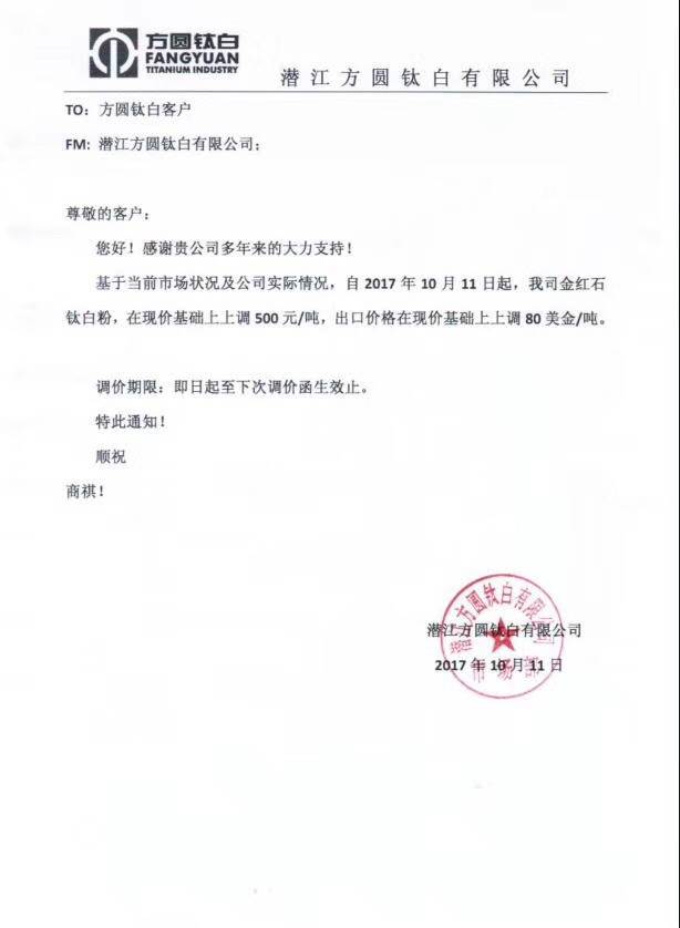 自10月9号以来,短短3天之内,以龙蟒佰利、山东东佳、中核钛白为代表的15家钛白粉企业集体发布涨价通知。据了解,本轮上调幅度基本为500元/吨,出口价格上涨幅度为50美元/吨、80美元/吨。