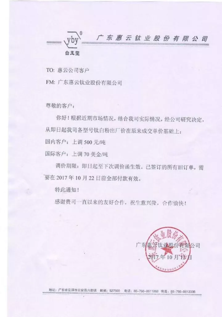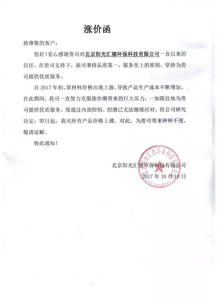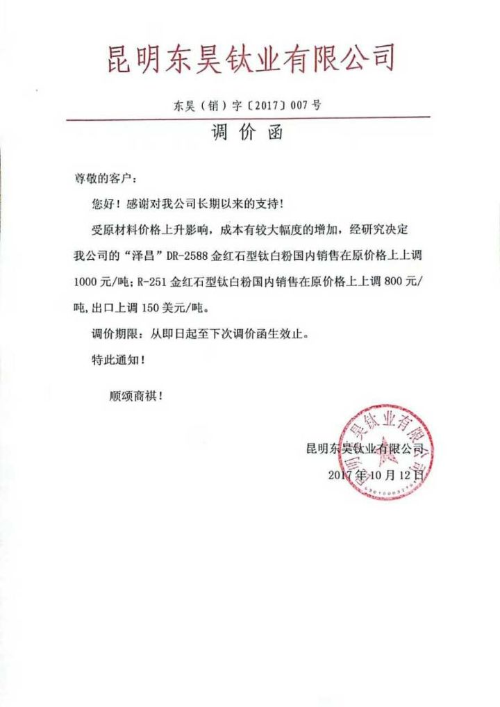 国庆后,涨价潮不断,一天一波。钛白粉涨,环保设备也涨,截止目前,已经有企业把资金实力以及诚信作为选择合作伙伴的重要条件。黄山美佳新材料有限公司下发通知,新增客户:小订单和账期两个月欠款的一律不接;如资金无法如期到位的老客户,粉末一律停止供货。又一波涨价函如下: