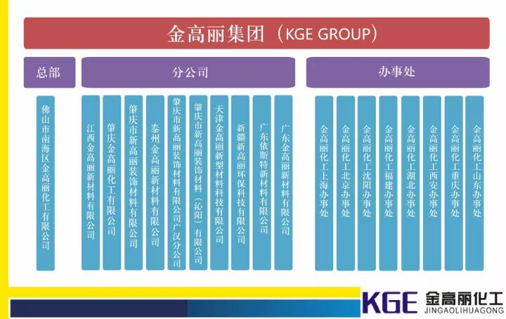 金高丽化工,创建于2002年,总部设在广东南海,是一家集专业研发、生产、销售氟碳涂料、粉末涂料、水性超晶泳涂料、防腐涂料及配套稀释剂等系列产品的专业化、集团化高新技术企业。金高丽化工旗下分别在广东、江苏设有生产基地,上海、北京、沈阳、山东设有办事处及调色中心并在成都、河南设立分公司。如广东金高丽新材料有限公司、广东依斯特新材料有限公司、新疆新高丽环保科技有限公司、肇庆市新高丽装饰材料有限公司等,都是它旗下的分公司。其结构图如下: