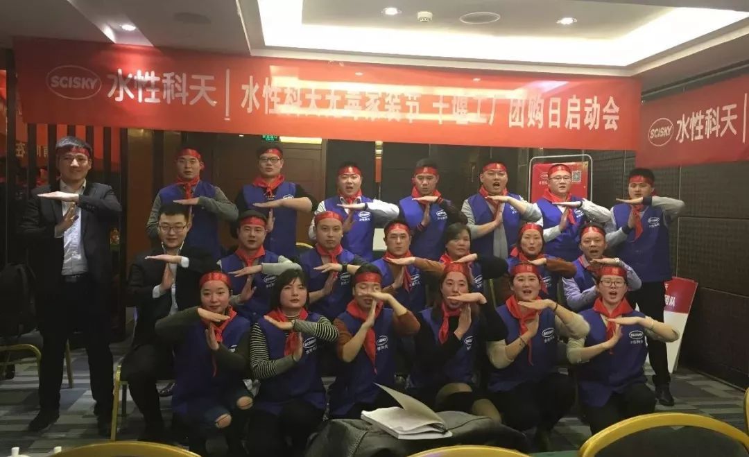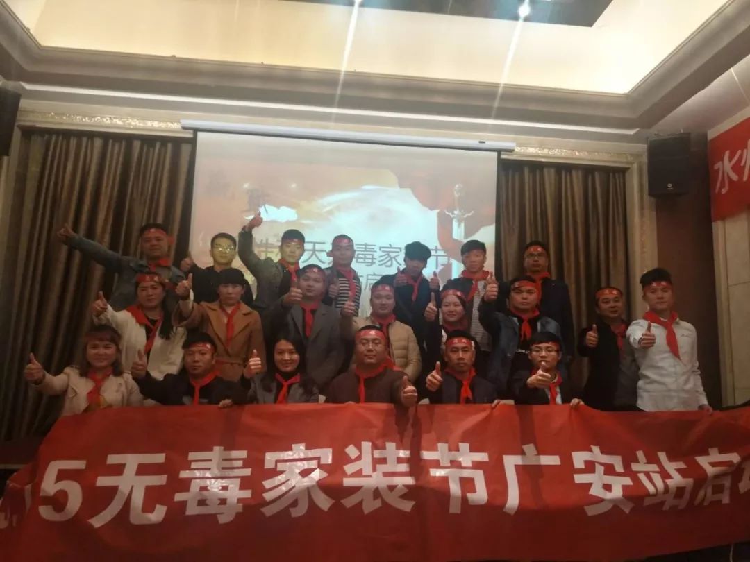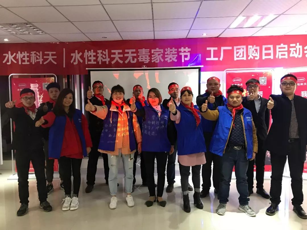 广安水性科天无毒家装材料馆内,阵阵呐喊声传来,无毒家装节启动会正在火热进行中,小伙伴们慷慨激昂,蓄势待发,迎接着挑战。