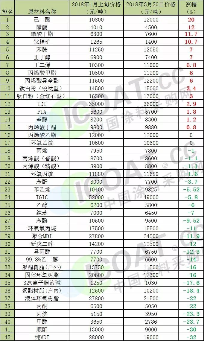 【中国涂料采购网】近一段时间,各种原材料价格涨价函漫天飞,特别是3月上旬表现更为猛烈,例如,攀枝花兴中钛业、金浦钛业、云南大互通、山东金海钛业、广西德天化工,广西金茂、攀枝花钛海,广西顺风,超彩等先后发布涨价通告,都有500-800元/吨的涨幅。由于原材料上涨气氛浓烈,一时之间,各企业很恐慌,争相囤货。然而,当我们统计2018年一季度以来原材料的涨幅排行,发现,真正上涨的却是己二酸,它不声不响地上涨了20%;醋酸上涨幅度达12%;醋酸丁脂上涨11.7%;钛白粉的上游原材料钛精矿上涨10.7%。不断下发涨价函的钛白粉,上涨幅度仅为3-3.4%。去年涨幅最大的环氧氯丙烷,今年第一季度下跌了11%。从统计的42种原材料来看,15种原材料出现不同幅度的上涨,2种原材料保持原有水平,25种原材料出现不同幅度的下跌。整体来看,原材料价格涨少跌多。