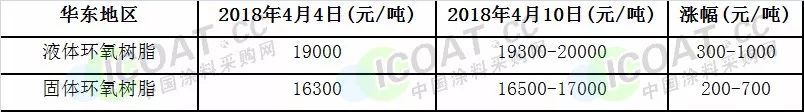 环保型涂料树脂等甲基丙烯酸甲酯下游应用领域,也均呈现出不同程度的上涨,据中国涂料采购网采购通消息, 4月10日,黄山地区环氧树脂大部分企业上调200元-700元/吨不等。截止4月10日,华东地区液体环氧树脂报价为19300-20000元/吨,固体环氧树脂报价为16500-17000元/吨。一反一季度下跌趋势,近日出现触底反弹之势。