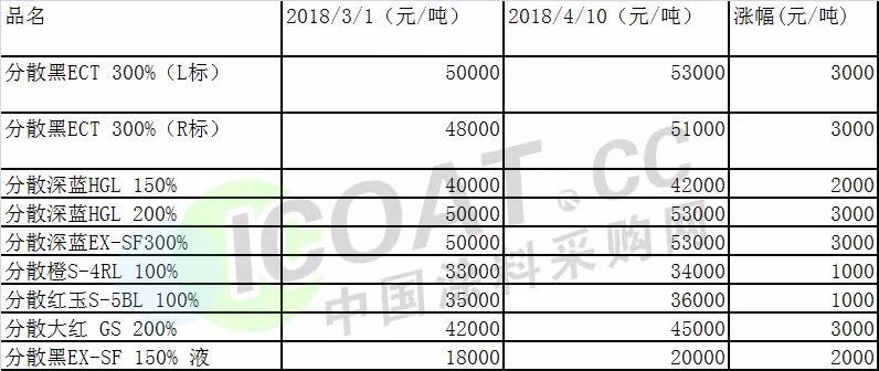 涨价是传染的,化工市场中有一个产品突然猛涨时,其他相关产业链产品不约而同涨起。据中国涂料采购网采购通消息,自2018年4月10日起,分散常规系列上调3000元/吨。分散黑ECT300%(L标)涨至53元/KG。