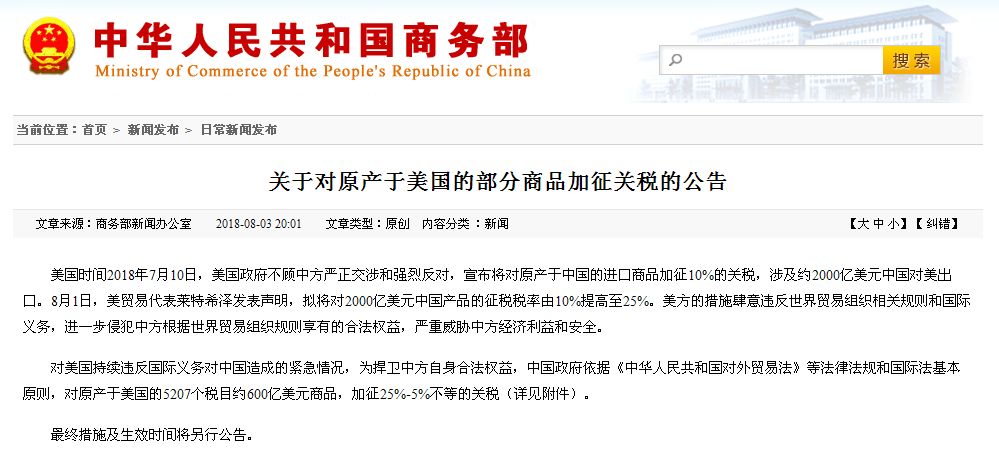 而在此之前,8月3日,国务院关税税则委员会决定对原产于美国的5207个税目约600亿美元商品加征关税,分为25%、20%、10%、5%四档税率。