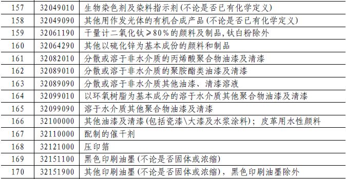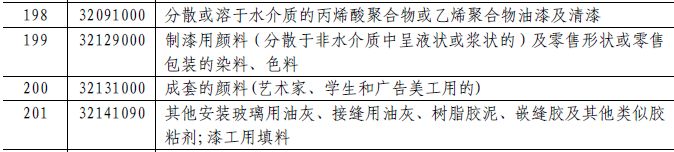 对列1078个税目商品加征20%的关税,包括:颜料及以其为基本成分的制品(不论是否已有化学定义)、干量计二氧化钛≥80%的颜料及制品,钛白粉除外、其他以硫化锌为基本成份的颜料和制品、分散或溶于非水介质的丙烯酸聚合物油漆及清漆、分散或溶于非水介质的聚胺酯类油漆及清漆、分散或溶于非水介质其他油漆、清漆溶液、以环氧树脂为基本成分的溶于水介质其他聚合物油漆及清漆、溶于水介质其他聚合物油漆及清漆、其他油漆及清漆(包括瓷漆\大漆及水浆涂料)、配制的催干剂、初级形状的不饱和聚酯、初级形状的酚醛树脂等化学品。