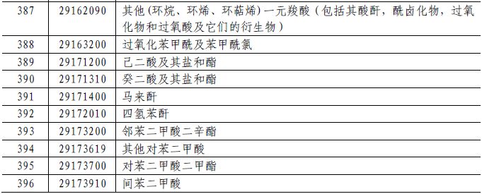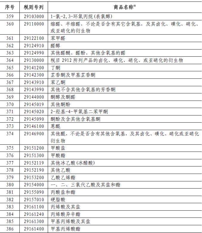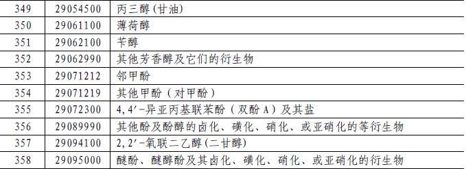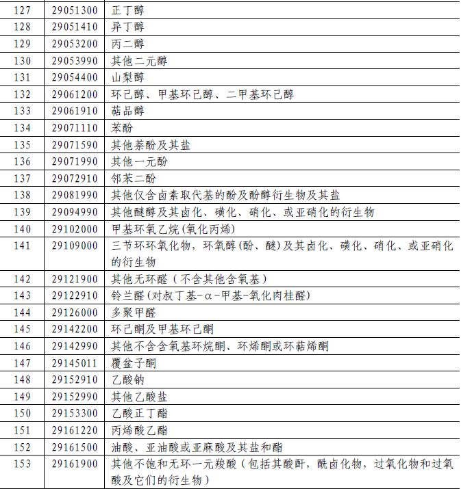 62个税目商品加征5%的关税,包括:丙酸、丙烯酸丁酯、合成靛蓝(还原靛蓝)(不论是否有化学定义)、用作萤光增白剂的有机合成产品(不论是否已有化学定义)、初级形状的其他纤维素醚、初级形状的其他未列名的纤维素(包括化学衍生物)、初级形状的其他未列名天然聚合物(包括改性天然聚合物)等化学品。