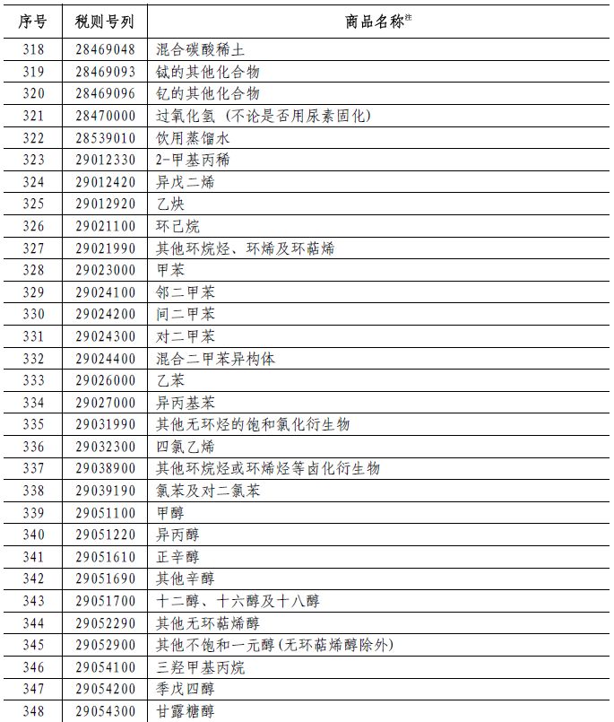 对原产于美国的2493个税目商品加征25%的关税,包括丙烯酸及其盐、苯甲醛、甲苯、甲基丙烯酸酯、以钒酸铋为基本成分的颜料及制品、群青及以其为基本成本的制品、分散或溶于非水介质的聚酯油漆及清漆等、分散或溶于非水介质的乙烯聚合物油漆及清漆、以氟树脂为基本成分的溶于水介质其他聚合物油漆及清漆、初级形状的聚甲基丙烯酸甲酯、聚合MDI、其他初级形状的其他氨基树脂、初级形状的硝酸纤维素等一大批石油和化学制品。