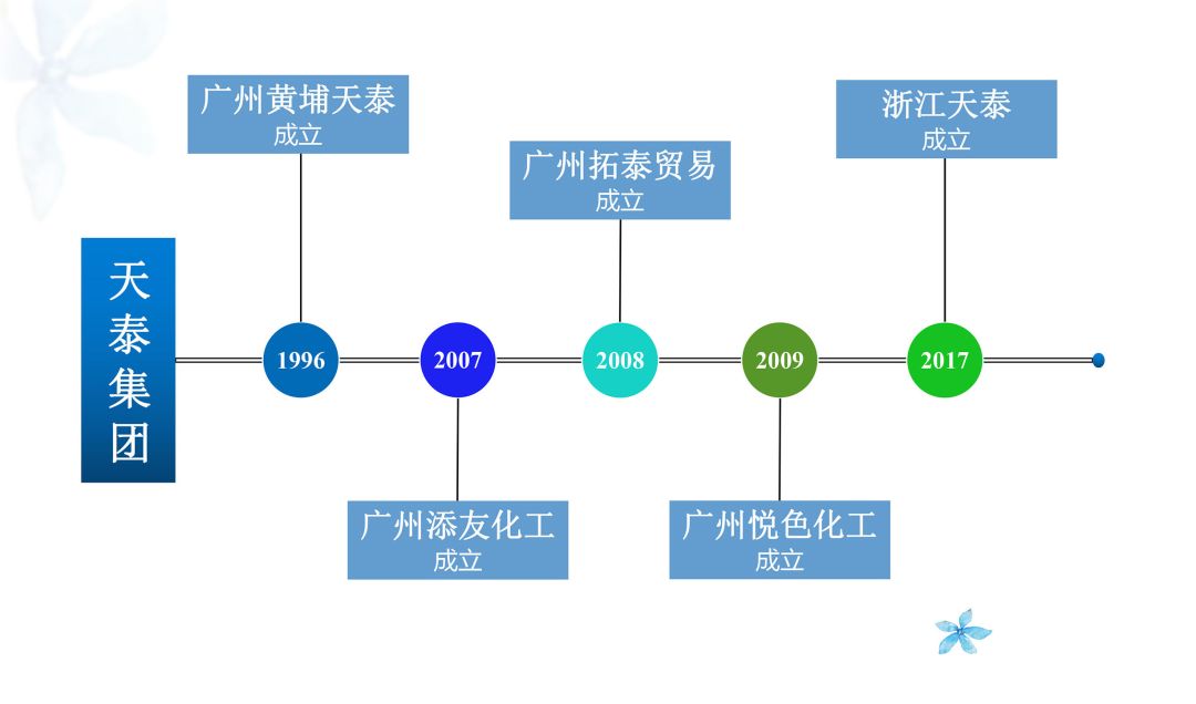 天泰集团为顺应时代的发展,正大力发展电商平台,致力于将线上与线下相结合,使得集团稳步壮大。目前,天泰集团旗下设有五个子公司,分别为广州市黄埔天泰化轻有限公司、广州添友化工有限公司、广州拓泰进出口贸易有限公司、广州悦色化工科技有限公司、浙江天泰新材料科技有限公司。集团重视电商发展,逐步建立网上销售平台,实现线上与线下的完美结合,促进集团的钛白粉、滑石粉、碳酸钙、硫酸钡、高岭土等相关化工产品的销售。