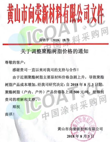 据涂料采购网消息,8月3日,黄山市向荣新材料有限公司发布《关于调整聚酯树脂价格的通知》,由于近期聚酯树脂主要原材料急剧上升,导致聚酯树脂产品成本增加,经公司研究决定:自2018年8月3日,聚酯树脂(户内、户外)产品价格各上调500元/吨。