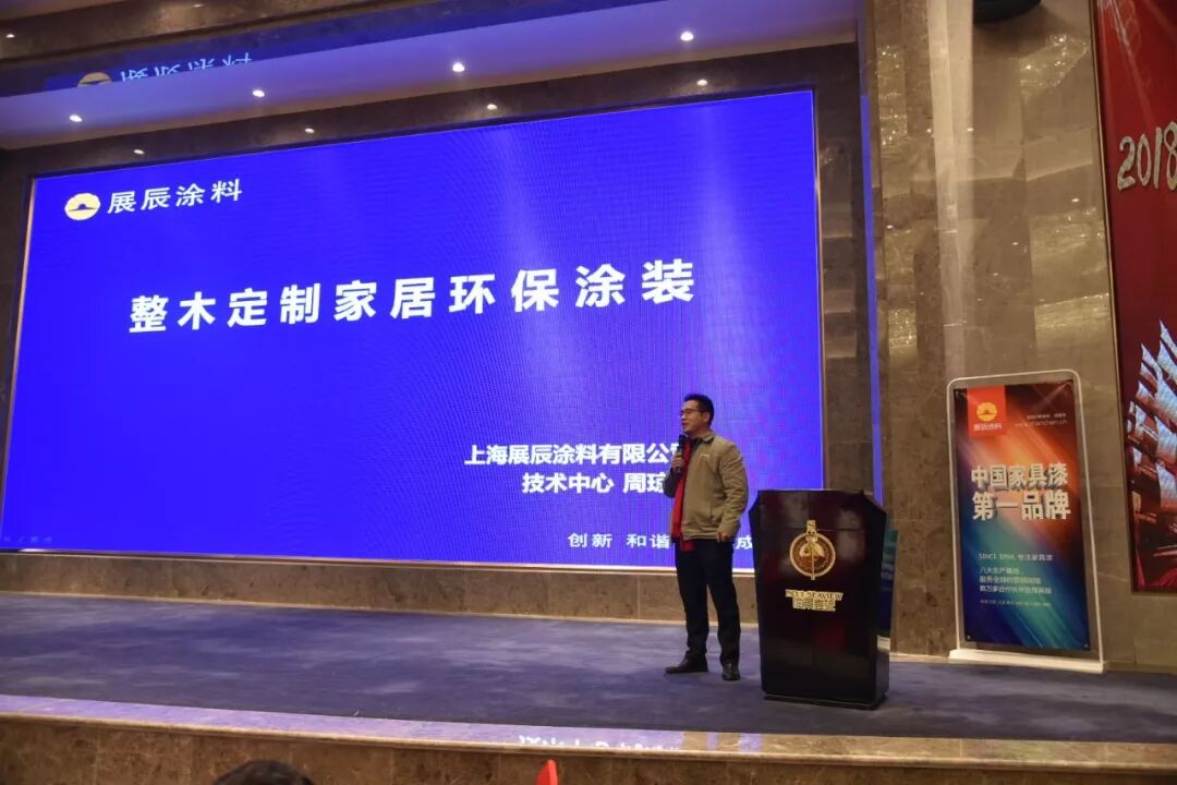 会上,展辰集团上海公司首席产品官周琼辉受邀作了《整木定制家居环保涂装》的专题分享。周总从“环保趋势”、“整木家居环保涂装”、“展辰独创应用技术”三大方面进行了介绍。2018年,多地陆续出台政策,进一步提高对环保的要求,部分不达标的家具厂已被关停。展辰作为民族涂料品牌领军企业,以前瞻性的战略眼光,率先进行水性涂料的研发工作,基于自身在水性涂料、UV涂料以及水性UV环保涂料方面的强大优势,创新性推出“家具环保涂装一揽子解决方案”,从家具制造企业现状分析、涂装生产线规划、运营指导与培训、日常维护与服务等多个维度,为家具制造企业提供全套服务,助力家具企业实现环保涂装升级。