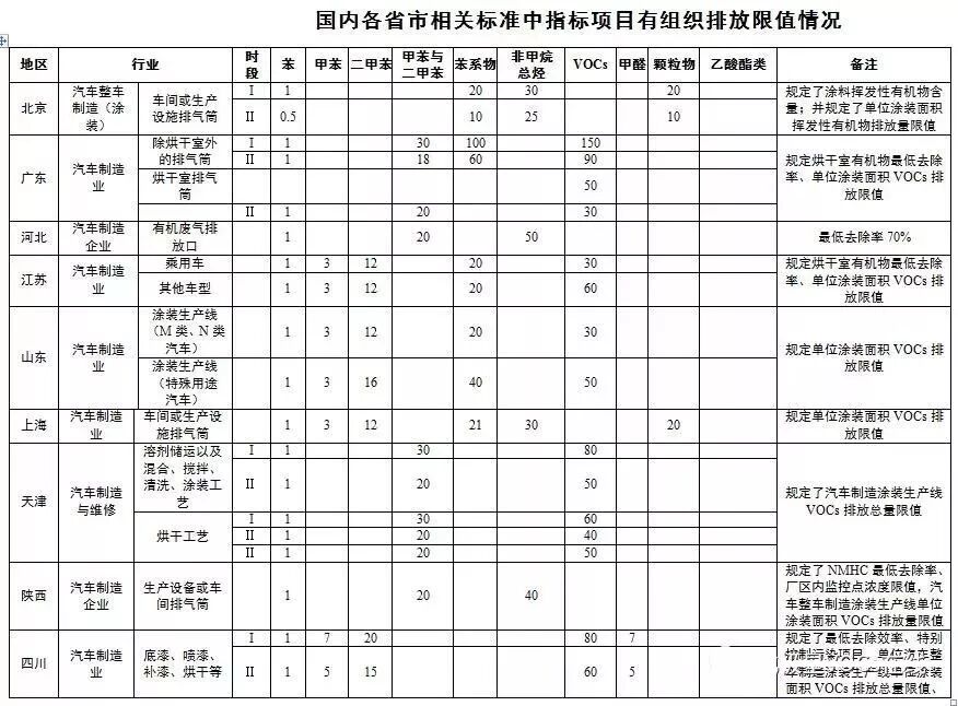 部分地区根据当地环境管理的需要,针对涂装的重点行业,如汽车制造、船舶制造、家具制造、集装箱制造等行业制定了相应排放标准,而且部分省份也出台了其它行业表面涂装的排放标准。