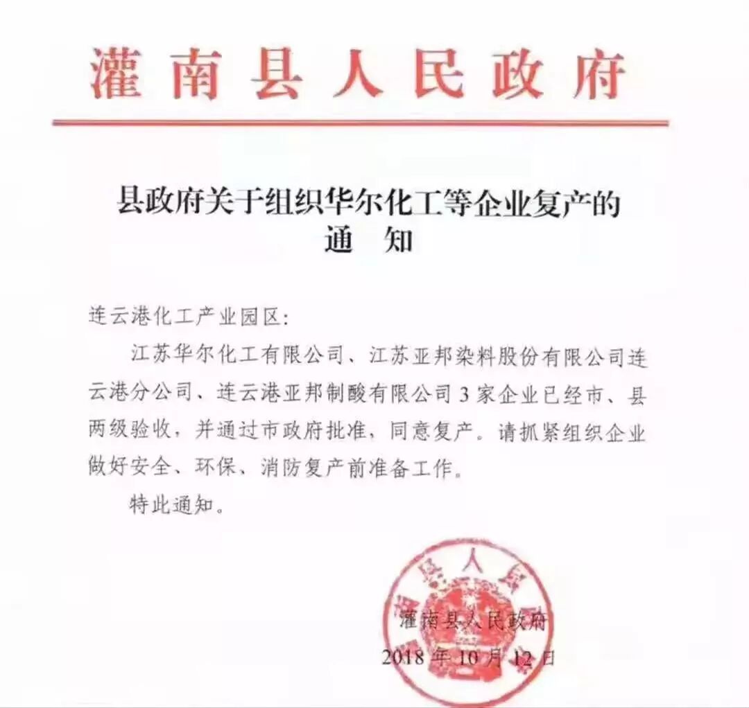 灌南县政府发布关于组织华尔化工等企业复产的通知: