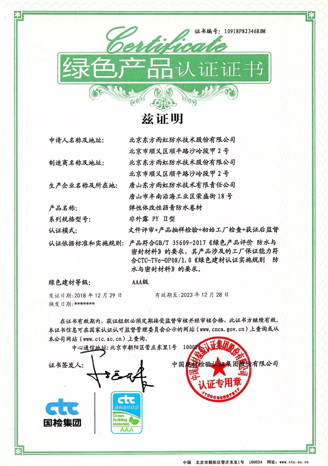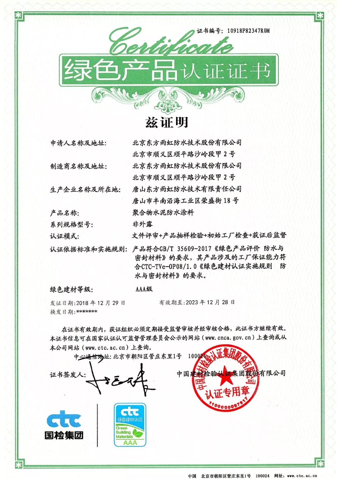 日前,中国建材检验认证集团(以下简称:国检集团)向东方雨虹颁发了首批绿色产品认证证书。