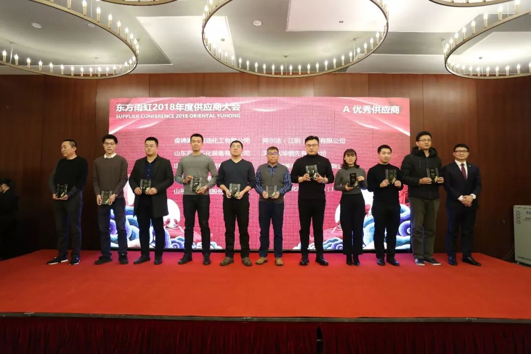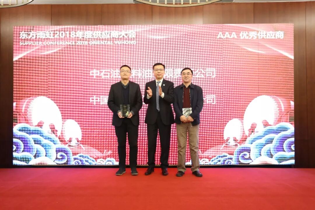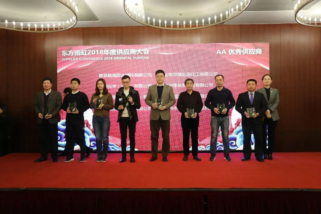会上,东方雨虹对2018年表现优异的56家供应商授予优秀称号。中石油燃料油有限责任公司与中国石化化工销售有限公司获评东方雨虹AAA级供应商。