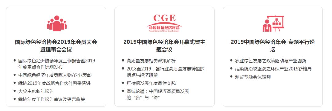 活动会议层面重点规划有三大版块:国际绿色经济协会2019年会员大会暨理事会会议、2019中国绿色经济年会开幕式暨主题会议、2019中国绿色经济年会-专题平行论坛,将有重点分节奏的进行经济对话,致力于为新一年的经济发展凝聚智慧与力量。