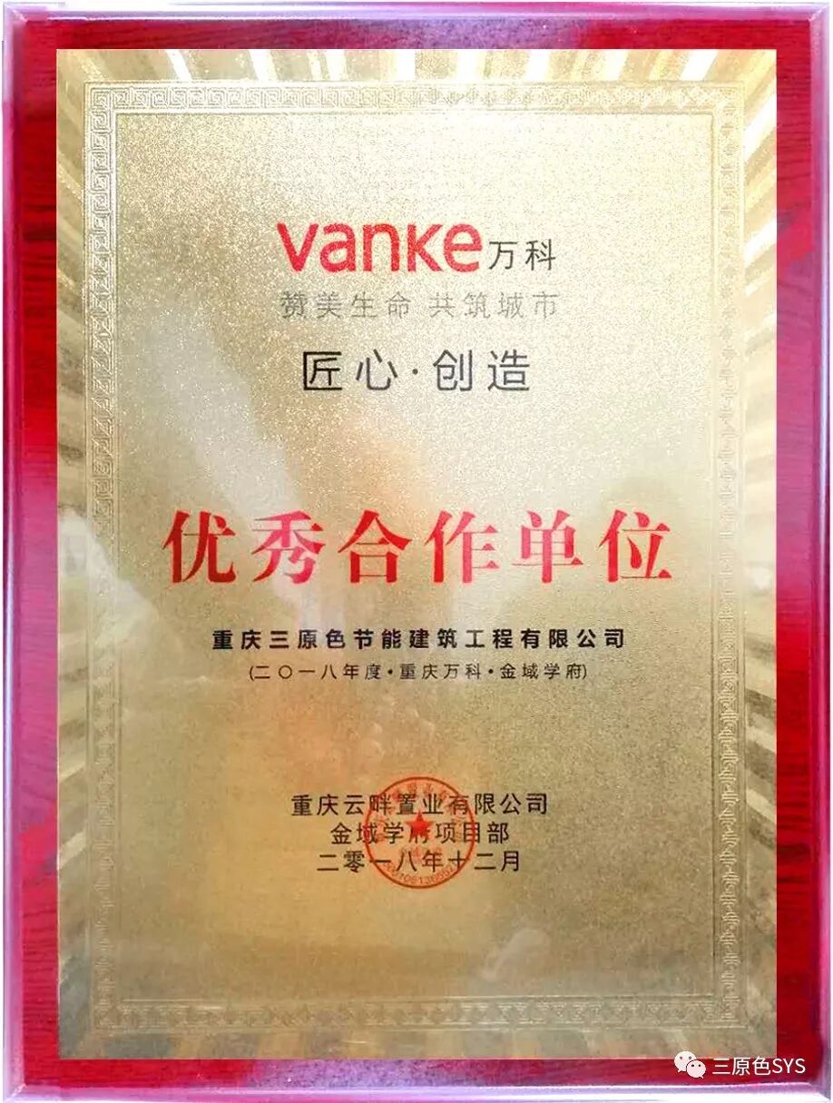 三原色重庆公司、成都公司、福州公司、上海公司近期获得了万科、保利和龙湖颁发的多项荣誉,其中万科颁发的荣誉有“优秀合作单位”奖、“交付评估中西部区域第一名”、“优秀项目团队”奖、“优秀项目经理”奖、“优秀项目主管”奖。