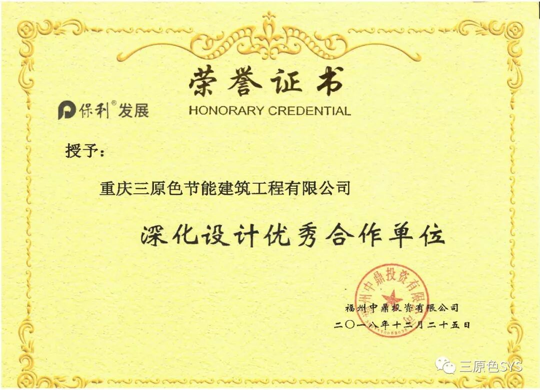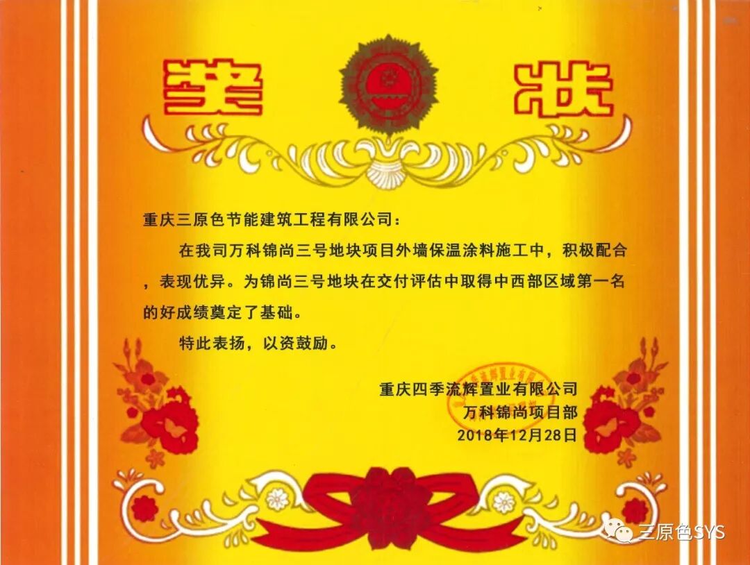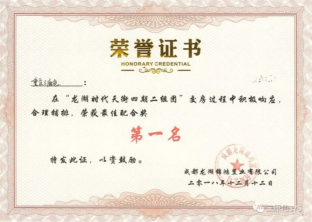 龙湖颁发的荣誉有“最佳配合奖第一名”。在与成都龙湖·时代天街项目合作的过程中,三原色不仅为该项目提供全过程服务施工,而且还在项目交房过程中积极响应,合理铺排,在同月连续两次受到了成都龙湖的高度赞扬和充分肯定!