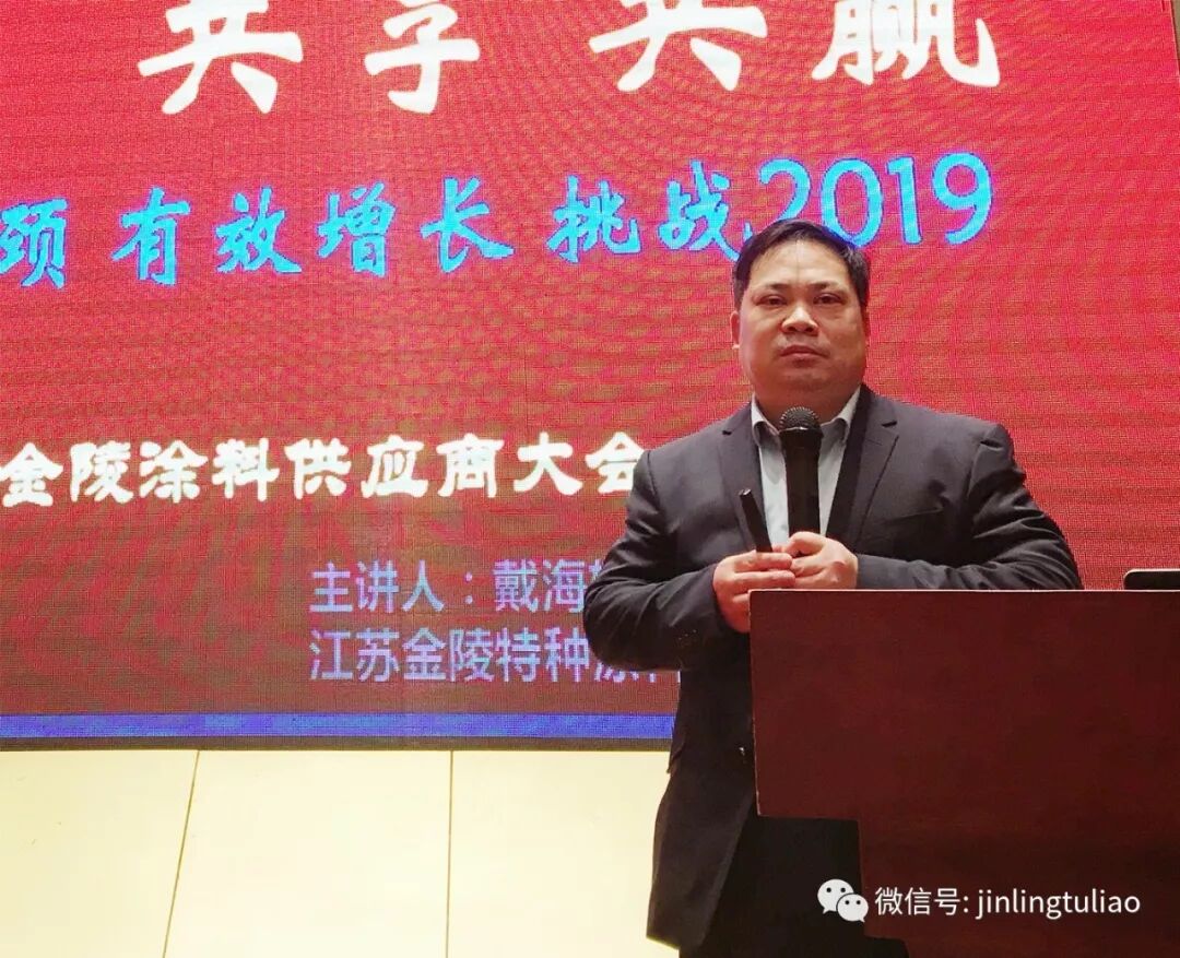 董事长戴海雄在会上向供应商代表们表示热烈的欢迎,并做了“聚焦,创新,共享,共赢”的主题报告。戴董从分析当前经济形势,防腐涂料的发展趋势,2018年金陵涂料回顾及2019年展望,品质与服务提升思路四个方面进行总结。他表示,公司去年遭遇了原材料大幅涨价、产品利润下降,安全环保高压势态等压力,2019年金陵涂料将以打造产品品牌和服务品质为核心,加大科研创新力度,以加快产品转型升级为动力,实现品质、服务、管理、创新等共同驱动业绩增长和品牌价值提升为总体思路,为社会创造更多的贡献。