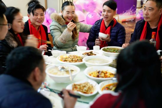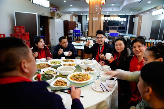 相聚在一起,就是缘分。为拉近在场家人之间的距离,让大家更好认识与交流,晚宴现场采用大圆桌的摆放方式。卡百利家人们共坐一桌,品尝美酒佳肴,领略渝味文化。