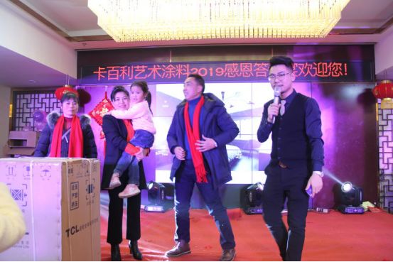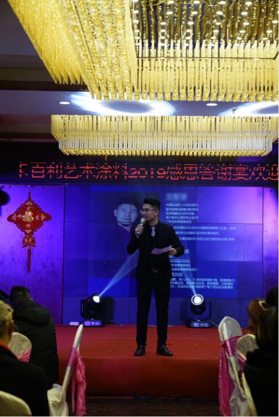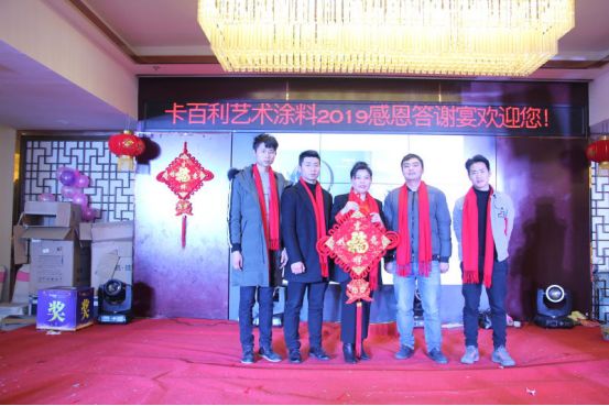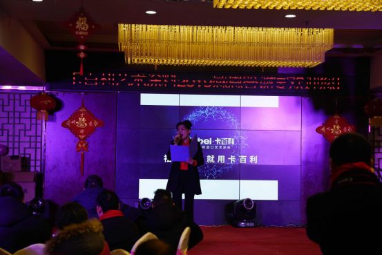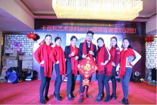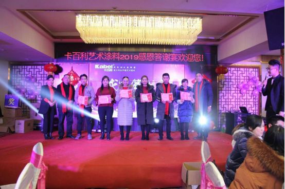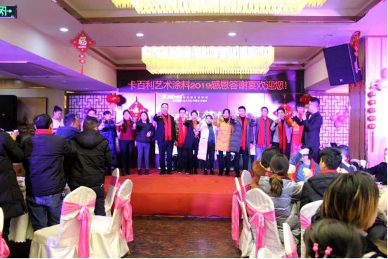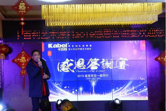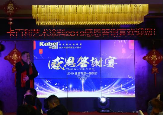 晚宴开始之际,卡百利艺术涂料重庆綦江经销商张总及各位嘉宾全登台向在座的家人们致祝酒词,举起,向在座的家人们,表达最真诚的感谢。
