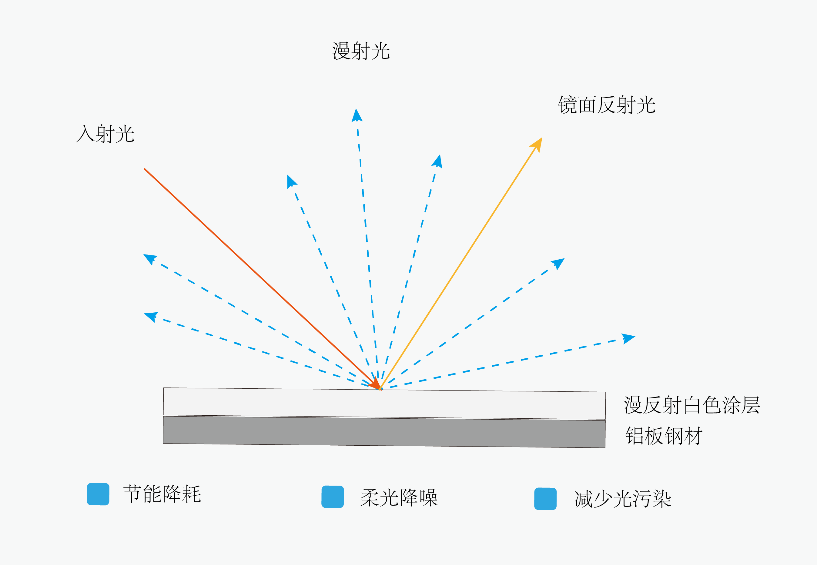 1、高耗能:一般卷材涂料漫反射率为75-80%,导致光线利用率不足,照明耗能大,难以满足节能要求,增加运营成本;