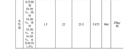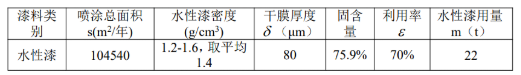 根据企业提供的水性漆中VOCs含量检测报告,项目使用的水性漆中挥发性有机化合物(VOCs)值为118g/L。水性漆的密度约1.2~1.6g/m3.则水性漆的挥发份约为9.1%,根据提供的MSDS的水含量为10~20%,本项目以15%计,则固体份为75.9%。项目喷漆区域,每道厚度约40μm,则总厚度为80μm。 水性漆用量核算表如下: