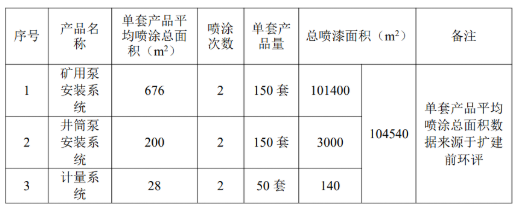 水性漆用量核算项目矿用泵安装系统、井筒泵安装系统、计量系统产品需要喷漆工艺(底漆1次、面漆1次,底漆、面漆均采用同一种水性漆)。则根据企业提供资料,每套产品的平均喷涂面积具体核算过程如下: