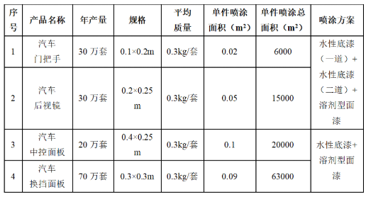 本项目主要将注塑车间冷却定型的汽车零部件进行喷漆,喷漆后作为产品直接外售。项目产品分为汽车外饰件(汽车门把手、后视镜)和汽车内饰件(汽车中控面板、换挡面板),汽车外饰件喷涂方案为:水性底漆+水性底漆+溶剂型面漆(汽车外饰件需喷涂两道底漆,使用同一种底漆,两道底漆喷涂厚度保持不变),汽车内饰件喷涂方案为:水性底漆+溶剂型面漆。