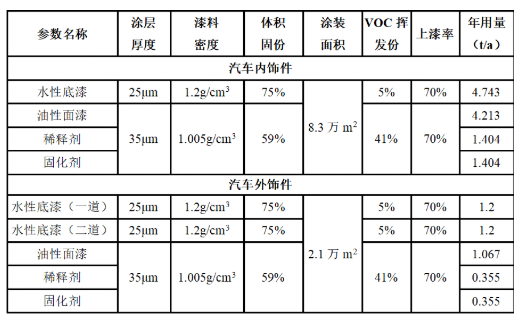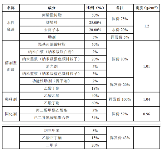 根据厂家提供MSDS,面漆密度为1.01g/cm3.稀释剂密度为1.04g/cm3.固化剂密度为0.96g/cm3.面漆(含稀释剂及固化剂)漆料施工状态下密度为1.005g/cm3.根据厂家提供的作业指导书,面漆、稀释剂及固化剂比例为3:1:1.面漆中挥发性有机物的占比为20%,稀释剂中挥发性有机物的占比为100%,固化剂中挥发性有机物的占比为43%。