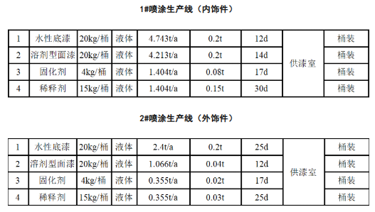 由上表计算结果,本项目水性底漆用量为7.143t/a,溶剂型面漆用量为8.798t/a。