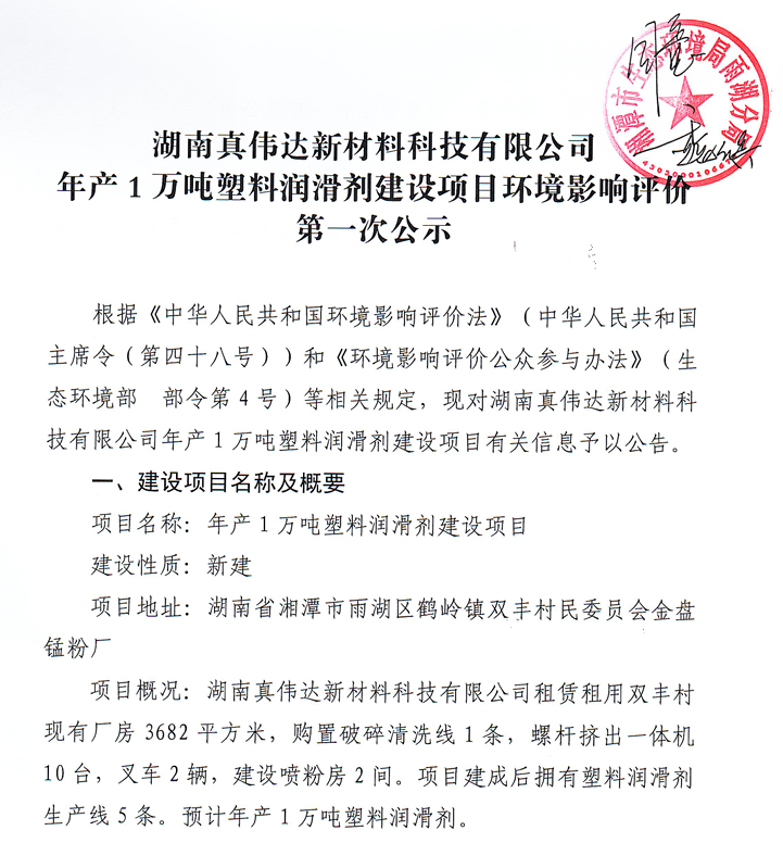 近日,雨湖区人民政府门户网站发布湖南真伟达新材料科技有限公司年产1万吨塑料润滑剂建设项目环境影响评价第一次公示。