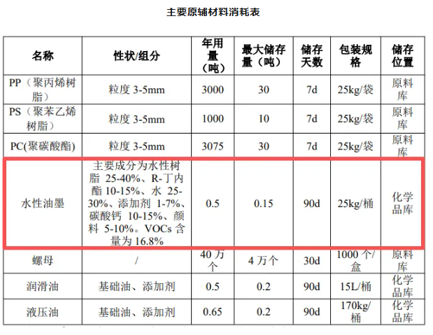 根据上表可知,水性油墨用量为0.494t/a,考虑到损耗等原因,本项目水性油墨用量取0.5t/a。