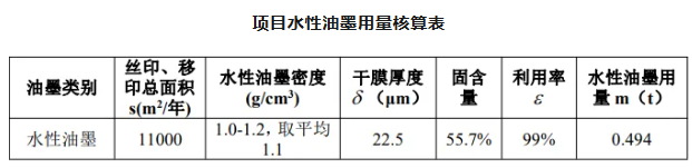 经核算,丝印、移印总面积约为11000m2.油墨厚度为20-25um,本项目取均值22.5um。水性油墨的密度为1.0~1.2g/cm3.取均值为1.1g/cm3.