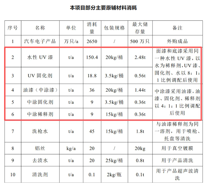 ①水性UV漆:本项目水性UV漆、固化剂、水调配完成后即用状态下VOCs含量为8.71%, UV漆调配后密度约为1.048g/cm3.根据《色漆和清漆挥发性有机化合物(VOC) 含量的测定 差值法》(GB/T 23985-2009)中方法3公式可推算得到水性 UV 漆 中 VOCs 的含量为 163g/L(不含水),符合《低挥发性有机化合物含量涂料产 品技术要求》(GB/T 38597-2020)中表 4 中 UV 固化涂料金属基材与塑胶基材 喷涂涂料的 VOCs 限值要求(350g/L)以及《工业防护涂料中有害物质限量》(GB 30981-2020)中表 4 辐射固化涂料喷涂水性漆 VOCs 含量限值要求(400g/L)。