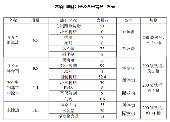 铁桶规格为直径580mm,高度900mm,总容积为237.6L。每个铁桶装油漆 装319-5绝缘漆200L,高度为750mm,小于铁桶总高度150mm符合。319-5 绝缘漆需要36桶,36*200*0.906=6.523.2吨,符合。319-x稀释剂采用相同规格铁桶,4桶总重量4*200*0.906=0.7244吨小于0.8吨,5桶总重量 5*200*0.906=0.906吨大于0.8吨,5桶用量符合。966生物基工业涂料采用相同规格铁桶,6桶总重量4*200*1.42=1.136吨大于1.1吨,符合。水性漆采用相同规格铁桶,71桶总重量71*200*1=14.2吨。符合根据以上分析,本项目理论319-5绝缘漆6.34 吨、319-x稀释剂0.8吨966生物基工业涂料1.054吨、水性漆用量为14.06t/a,与建设单位提供的319-5绝缘漆6.5吨、319-x稀释剂 0.8吨966生物基工业涂料1.1吨、水性漆用量为14.1t/a, 基本相符。