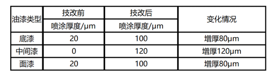 根据建设单位提供资料,厂区原有框架采用手动喷涂,本次项目由于产品需要出口,故部分框架采用自动喷涂;同时增加喷漆厚度,不改变喷漆面积,根据建设单位提供的资料,技改前后,框架的喷涂厚度变化情况如下表。