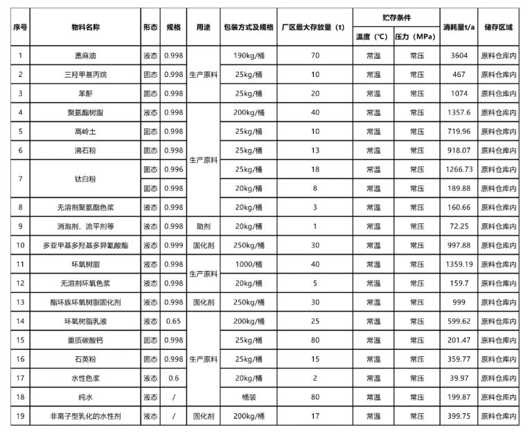 项目建成运行后主要物料消耗情况及储存方案汇总一览表