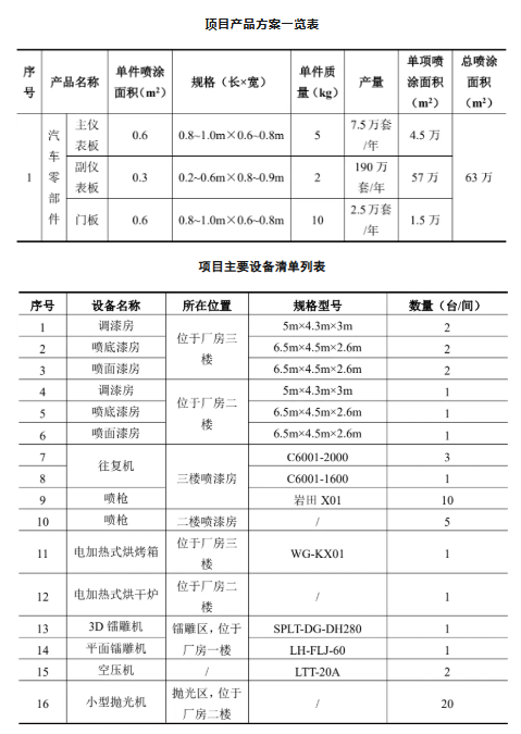喷漆区:位于厂区3楼中部和2楼西侧,3楼布设2个喷底漆房、2个喷面漆房,2楼布设1个喷底漆房、1个喷面漆房,3楼建设2条喷漆线,2楼建设1条喷漆线