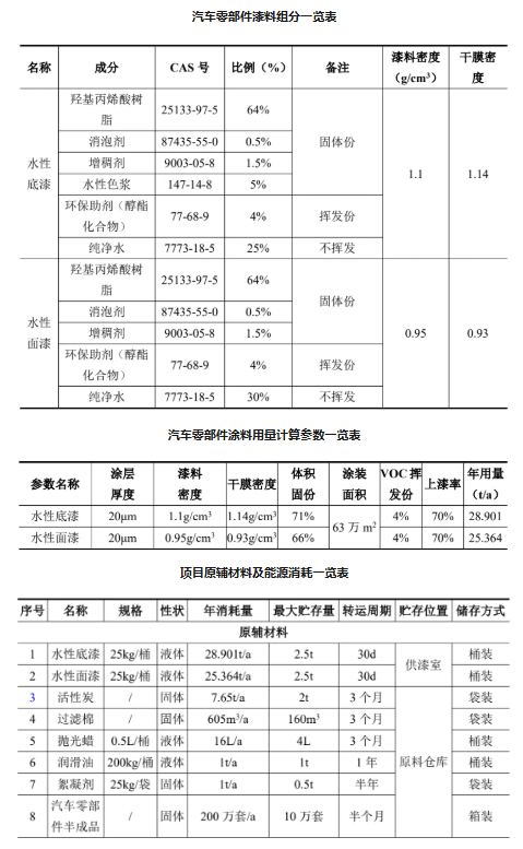 根据涂料厂家提供的参数,汽车零部件水性底漆密度为1.14g/cm3;水性面漆密度为0.93g/cm3.