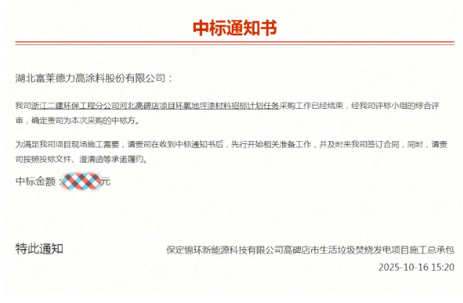 近日,湖北富莱德力高涂料股份有限公司(以下简称“富莱德力高涂料”)在激烈的市场竞争中脱颖而出,成功中标保定锦环新能源科技有限公司高碑店市生活垃圾焚烧发电项目的环氧地坪漆材料采购任务。富莱德力高涂料凭借优质的产品性能、完善的技术方案及可靠的履约能力,获得评标小组的一致认可 。