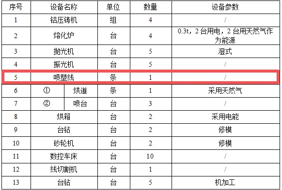 主要生产设施及设施参数表