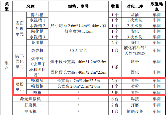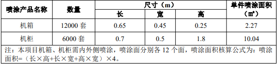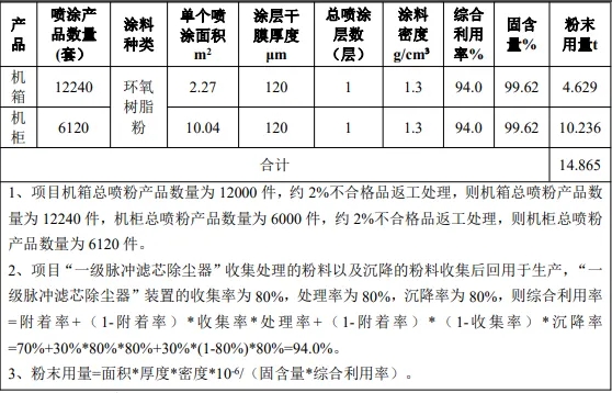项目单套机箱喷粉面积约为2.27m2.单套机柜喷粉面积约为10.04m2.需要静电喷粉的机箱为12000套/年,机柜为6000套/年,根据《排放源统计调查产排污核算方法和系数手册》(公告2021年第24号)中“33-37.431-434”机械行业系数的14涂装-粉末涂料-喷塑的颗粒物系数300kg/t-原料,则环氧树脂粉附着率为70%,根据建设单位提供的MSDS文件及检测报告可知, 项目环氧树脂粉的密度为1.3g/cm³,环氧树脂粉VOCs含量为<5g/L,本项目取5g/L(根据密度折算VOCs含量约为0.38%),则环氧树脂粉的固含量约为1-0.38%=99.62%。则项目环氧树 脂粉的用量核算如下: