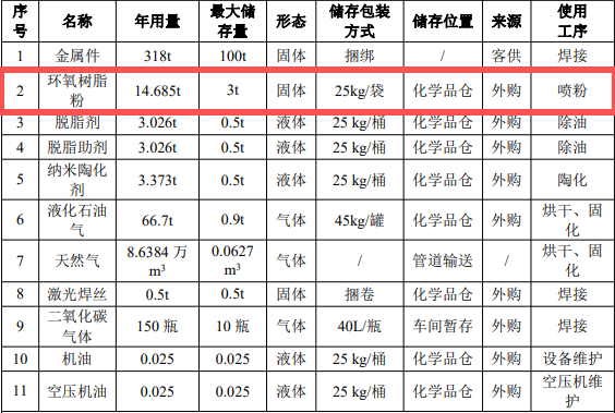 环氧树脂粉:主要成分为固态聚酯树脂60%、钛白粉28%、填料(沉淀硫酸钡)5%、固 化剂4%、助剂(流平剂)3%。物理状态:白色粉末,pH:6.5-7.5.相对密度:1.3g/cm3.根据VOCs检测报告可知,粉末涂料的挥发性有机化合物含量为<5g/L,根据《低挥发性有机化合物含量涂料产品技术要求》(GB/T 38597-2020) 中可知,粉末涂料产品中VOC含量通常很少,属于低挥发性有机化合物含 量涂料产品。