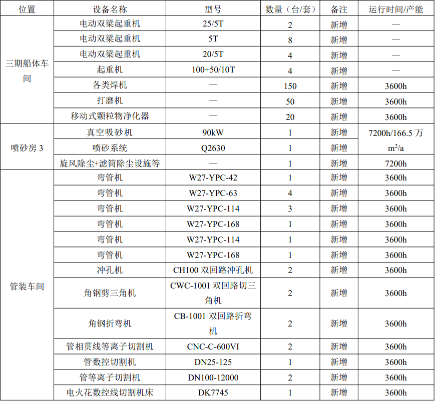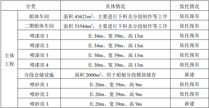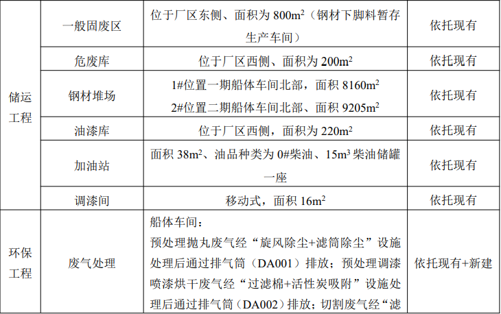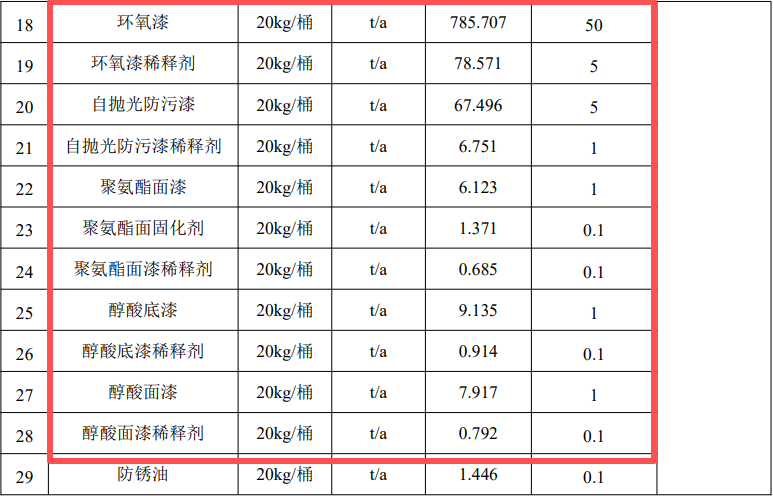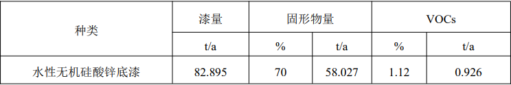 根据上式计算,油漆理论使用量(包含稀释剂、固化剂等)分别为环24.954ta、防污漆5.098ta、聚氨酯面漆0.771ta,根据现有工程生产经验,企业提供油漆用量分别为环氧漆26.643ta、防污漆5.481t/a、聚氨酯面漆0.879ta,本次环评采用企业提供的油漆等用量。