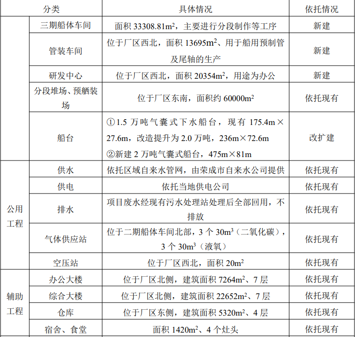 黄海造船有限公司拟投资48660万元建设黄海造船有限公司船舶制造项目,项目位于荣成市石岛管理区桃园街道青木寨村南,中心点位于122.469403°E、36.930211°N,现有厂区占地面积为259495m2.本项目新增用地面积为 41858m2.项目新增员工300人,项目新建2万吨气囊船台、改造提升2万吨气囊船台、新建三期船体车间、分段仓储设施、研发中心、管装车间;项目造船产能为7.98万吨/年(47.8万载重吨),利用荣成市神飞船舶制造有限公司置换13 万吨/年(71万载重吨)造船产能中的8万吨/年造船产能(47.8万载重吨),不新增造船产能。
