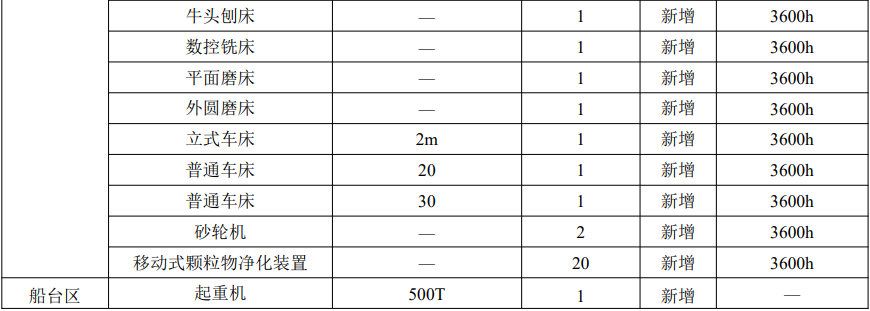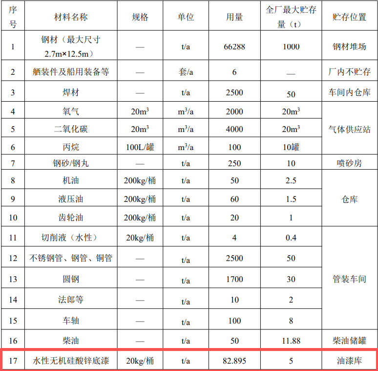 根据上式计算,油漆理论使用量(包含稀释剂、固化剂等)分别为环漆788.726t/a、防污漆59.305ta、聚氨酯面漆5.788ta、醇酸底漆9.314ta、醇酸面漆8.210ta、防锈油1.382t/a,根据现有工程生产经验,企业提供油漆用量分别为环氧漆794.712ta、防污漆59.790ta、聚氨酯面漆5.914ta、醇酸底漆10.049ta、醇酸面漆8.709ta、防锈油1.446t/a,本次环评采用企业提供的油漆等用量。
