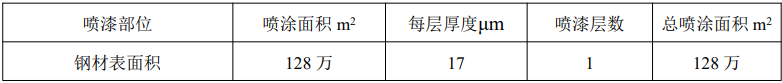 项目入厂钢材全部需要进行预处理喷漆,一遍水性漆后进行烘干,总喷漆面积为128 万平方米,喷漆厚度为17um。